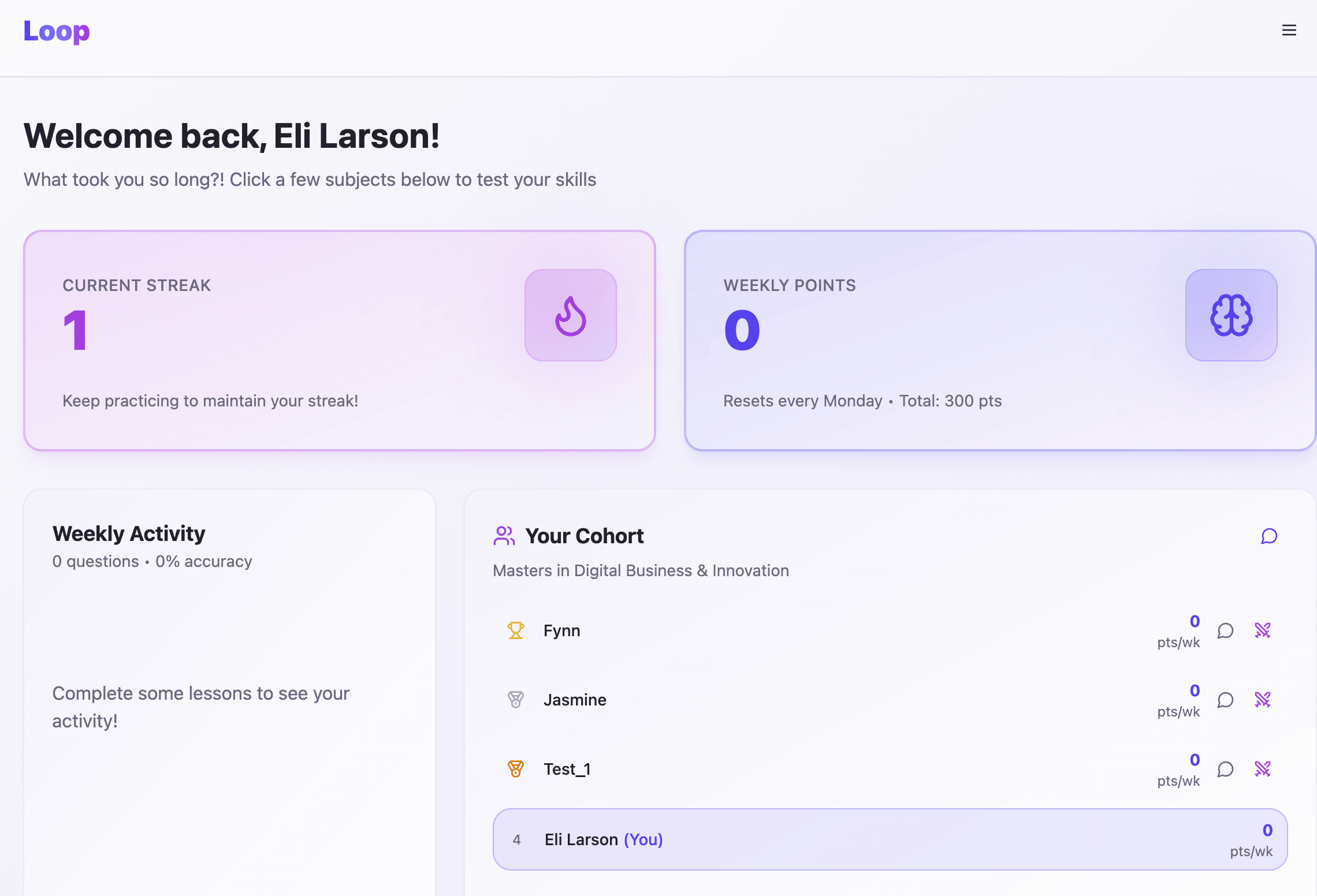 So the idea is simple, student's have all these tools, but still study from ppts because the exams are so similar to them, word for word questions etc. Loop connects professors with students, in that a professor could "create" a class, and drop in their appropriate power points into an AI engine and generate a roadmap.